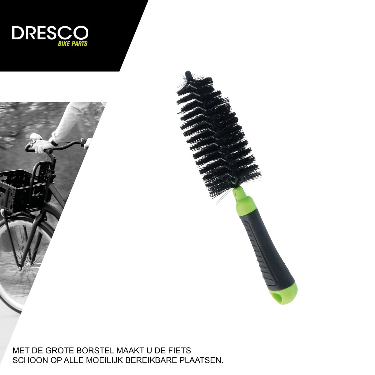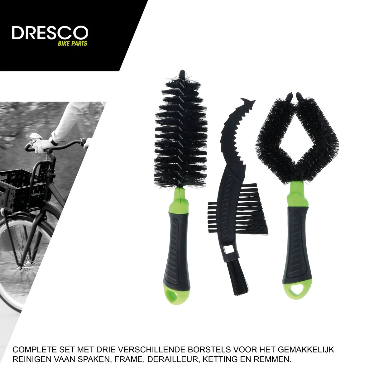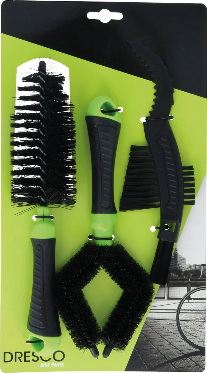 Met de Dresco fiets onderhoud borstels maakt u de fiets snel en grondig schoon. De Dresco set bestaat uit drie verschillende borstels, allen met een eigen functie/werking. Een borstel waarmee u het vuil eenvoudig tussen de tandwielen kan weghalen. Met de gekartelde kunststof kant haalt u het grove vuil tussen de tandwielen, daarna met de borstel het losgemaakte vuil goed kan verwijderen. De gekartelde kant past tussen de verschillende tandwielen van de fiets. Met de grote borstel maakt u de fiets schoon op alle moeilijk bereikbare plaatsen. De O borstel is voor het schoonmaken van het frame van de fiets. Door de opening aan de bovenkant van de borstel schuift u de borstel makkelijk om het fietsframe.