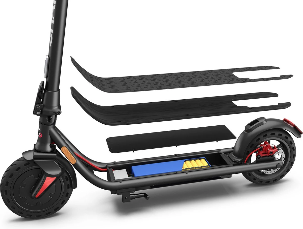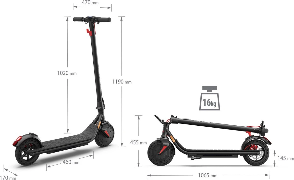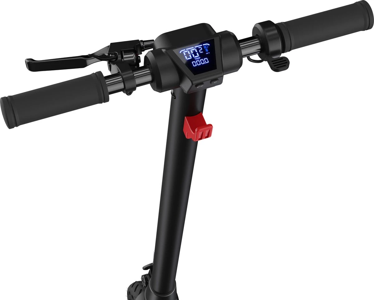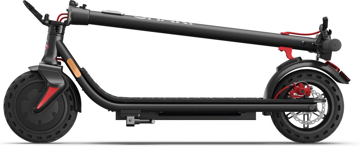 De zwarte afwerking met rode accenten geeft de e-scooter een sportieve look. De brede voetsteun zorgt voor een comfortabele rit. Het stuur, dat hoger dan 110 cm is, zorgt voor een stabiele rit en soepel stuurgedrag, zelfs bij hogere snelheden.