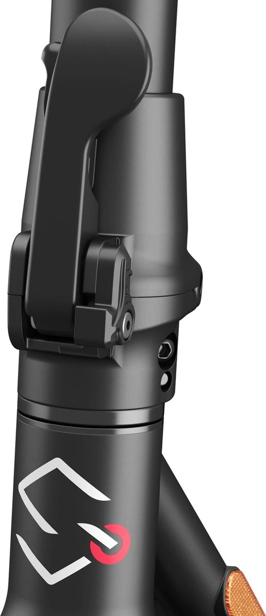 De e-scooter is uitgerust met een witte koplamp en een rood achterlicht, dat ook knippert als je remt. De voor- en achterreflectoren en oranje reflectoren aan de zijkant van de e-scooter bieden extra veiligheid.